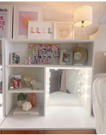 Girls love a great mirror by their desk! It cuts down on traffic in the shared bathroom, so it is practical. Here is a precious pale pink one (with lights!). Here is a smaller white one, also lit. And here is one that doubles your space (and they can check their ‘fit!)